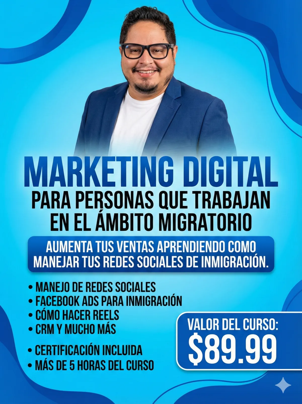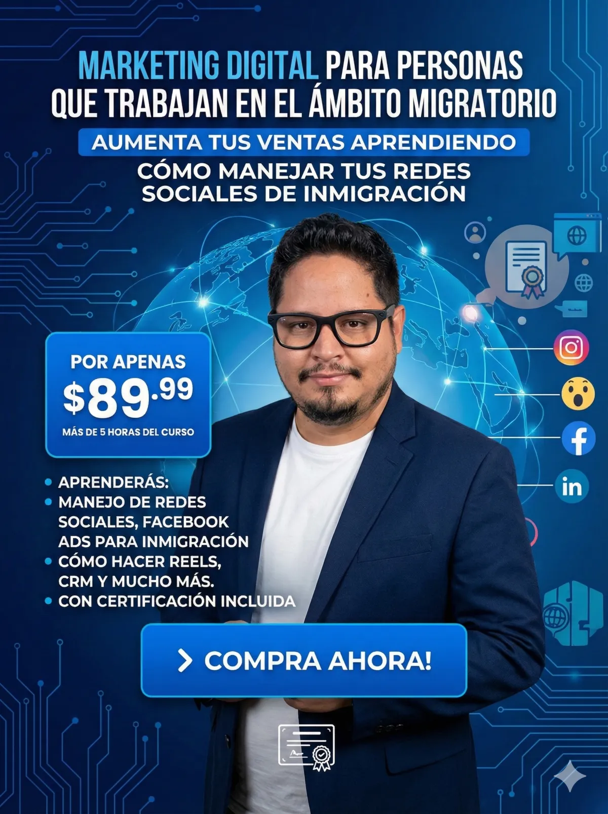 Descubrirás cuáles son las redes sociales que realmente funcionan en el mundo migratorio, cómo usarlas estratégicamente, prepararlas correctamente y convertirlas en una herramienta constante para atraer más clientes y generar confianza.